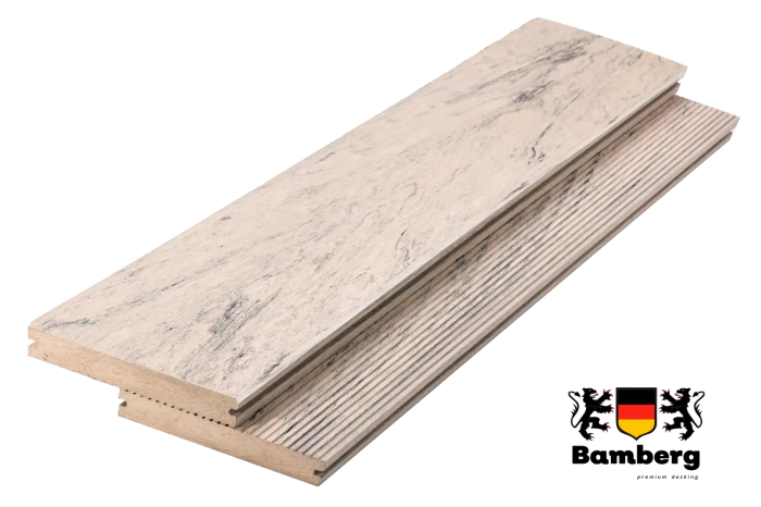 Террасная доска Bamberg - 60% древесного волокна (твердые лиственные породы дуб, ясень, клен, тополь) 35% ПЭВП 5% добавок, включая краситель;